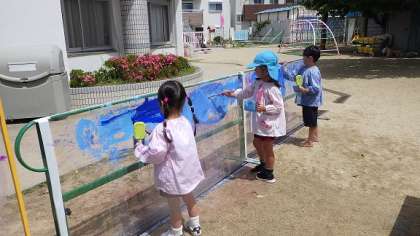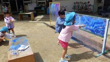「雨がザーザー降っているね」と子どもたちは大盛り上がりでした。園庭で絵を描きました。