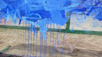描いた絵に水鉄砲を当てると、絵の具が下に垂れてきました。