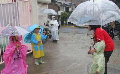 あいさつ当番の子どもたちも早くから登園し、雨の中でも元気な声を響かせていました。