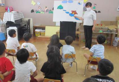 大型絵本や紙芝居、パネルシアターなどで、子どもが親しみやすそうな内容や季節が感じられるおはなしを聞かせてくださいました。