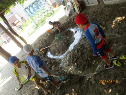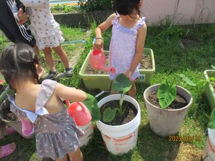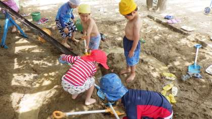 お花に水やりをしながら水が体にかかったり、砂場では友達と一緒に水を流して海をつくったり船を浮かべたりして、水の冷たさや心地よさを感じています。