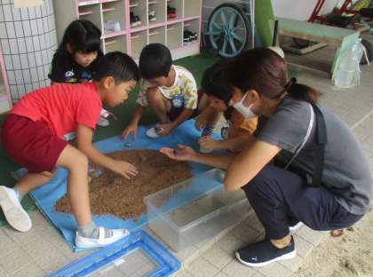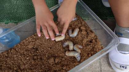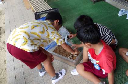 土を足してあげようと開けてみると、夏にはまだ小さかった幼虫がぐんとおおきくなっていました!「自分でもぐっていったなぁ」「どんどんもぐっていく!」友達と囲んでじっくりと見ていました。