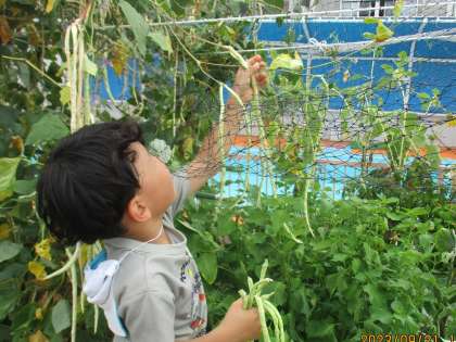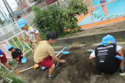 幼虫を見つけようと、花壇の土を掘っていた子どもたち。隣の花壇では、サンシャクササゲのさやを取っていました。