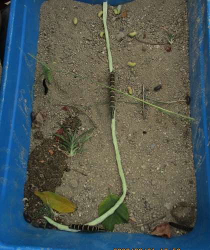 幼虫のおうちに、サンシャクササゲを入れると……。
