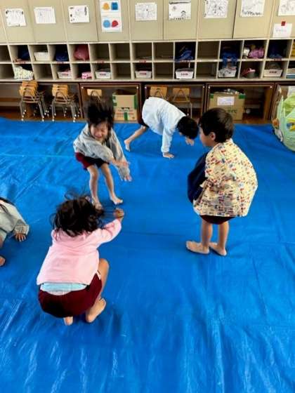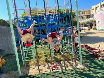 園庭では、ジャングルジムで逆さになったり「バタバタ」と羽を広げたりして、コウモリごっこを楽しんでいました。