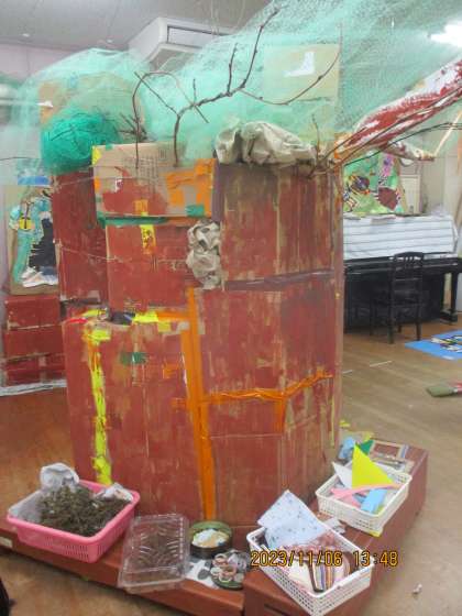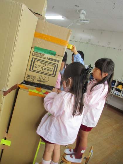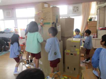 「カブトムシは木におる!」「おーっきな木に!」と、箱を積み重ねることから始まった大きな木づくり。みんなでつくった木の下でつくったりかいたり…あたたかな雰囲気の中で過ごしています。