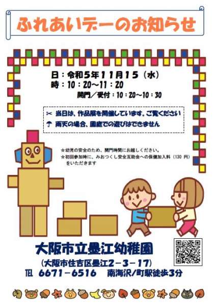 11月ふれあいデー 公開日 2023/11/13 更新日 2023/11/13 お知らせ 11月15日(水)10:00〜11:00 屋内で作品展をしています。子どもたちの作品をご覧ください。 お天気がよければ、園庭でも遊んでいただけます。 いいね(0)