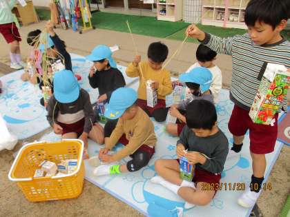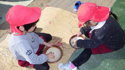 収穫した稲の脱穀、籾すりをしています。「わあ!白いお米でてきた!」「お米とるの、めっちゃ大変!」と言っていた子どもたち。脱穀したお米は今度精米します。楽しみに待っていてね。