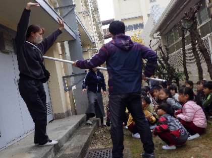 子どもたちにさすまたの使い方を伝えると、真剣に話を聞いていました。