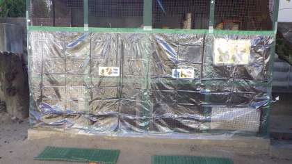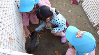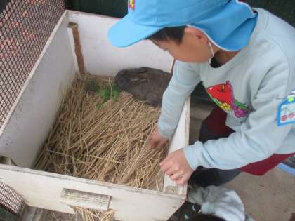 寒くなってきたので、うさぎのあんこちゃんときなこちゃんのお家にもビニルをかけました。「ブロッコリーの葉っぱあげる!」と畑から取ってきて、やさしくお世話してくれています。
