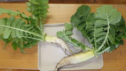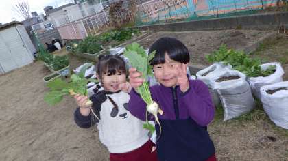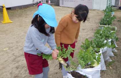 ゆり組はダイコンを、ばら組はカブを収穫しました。