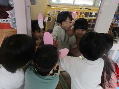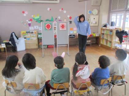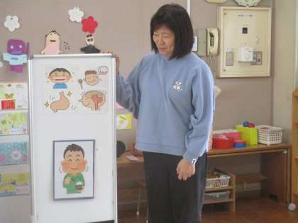 養護教諭の「子どもの歯は何本あるかな?」という質問に、「見てくる!」と言って鏡の前で自分の歯が何本あるか数えていました。正解は20本!大人は32本!子どもと大人では、口の大きさが違うことにも気が付きました。30回よく噛んで食べることで、歯が強くなることやご飯が細かくなりお腹の調子が良くなることを教えてもらいました。その後の弁当では、「30回噛んだよ」とよく噛むことを意識しながら食べる姿が見られました。