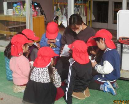 折り紙で作ったコップや升に大豆を入れてもらうと「いいにおい!」「ピーナツ?」「大豆や」と言いながら、匂いを嗅いでいた子どもたち。心に住む鬼をやっつけ、健康や福を招き入れようとみんなで豆まきです。