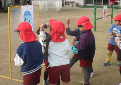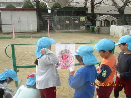 「泣き虫を鬼をやっつけるわ」「おこりんぼう鬼がとんでいくなぁ」「ぼくはもう、優しいからなぁ…風邪をひかないように…」とそれぞれの思いで元気に豆まきをしました。