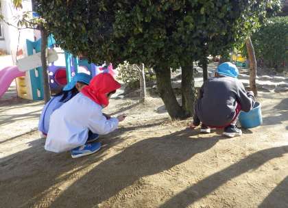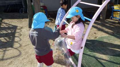 「袋から飛び出る木あった!」「めっちゃでかい石あったで」と、園庭を探し回り、ゴミ袋がいっぱいになりました!