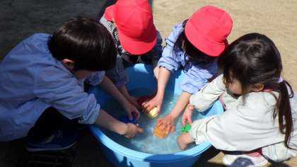 前日に「ピカピカになった!」「次は水色になるなあ」と、進級を楽しみにしながら、保育室や遊具の掃除を行いました。