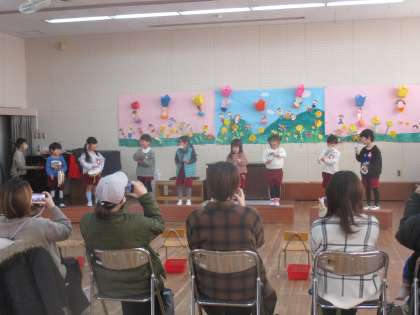 修了式で年長児が修了証書をいただいたように、一人ずつ園長先生から絵本のプレゼントをいただき、幼稚園で楽しかったことを発表しました。今度は、一つ大きくなったゆり組のみんなに会える日を、楽しみにしています♪