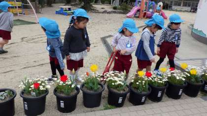 ゆり組に進級し、新しいマークや水色の帽子に喜んだり、「桜咲いてる〜!」「見て!赤いチューリップ咲いてる!」と、自分の鉢のチューリップや桜が咲いていることを、友達と知らせ合ったりしていました。