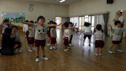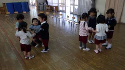 お外でたっぷり遊んだ後は、遊戯室で体操やなかよし遊びをしました。