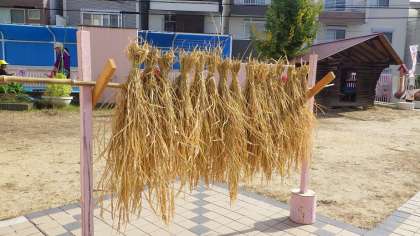 稲刈りをしました 公開日 2025/11/12 更新日 2025/11/12 お知らせ お米の実がぷっくりと大きくなったので、稲刈りをしました。 去年経験しているゆり組さんは、 「あ、知ってるー!」 と張り切って取り組んでいました。 手でしっかり握って、はさみで切り、束ねて干します。 「もう食べれる?」 と聞いてくる子どももいましたが、まだまだです… しばらく干して、次は脱穀をします。 楽しみにしていてくださいね♪ いいね(0)