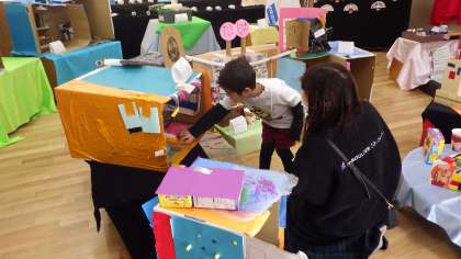年長児の部屋は、『ゆりぐみタウン』となって素敵な家々が並び、細かな表現に取り組んだ子どもたちが、嬉しそうに保護者の方に作ったものや工夫した点、難しかったところなどの話をしていました。