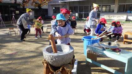 もち米のいいにおいや火を焚いているにおいが漂ってきたり、園庭に臼があったり、いつもと違う雰囲気にウキウキして登園してきた子どもたち。