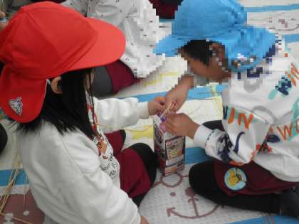 「押さえててね!」「ひっぱるよ!」「わぁ!はがれた!」「いっぱいとれたよ!」