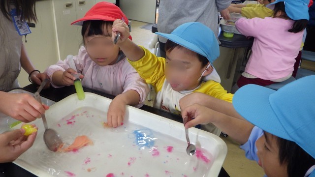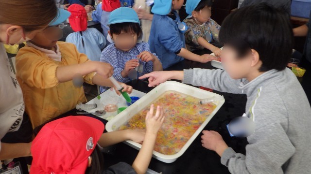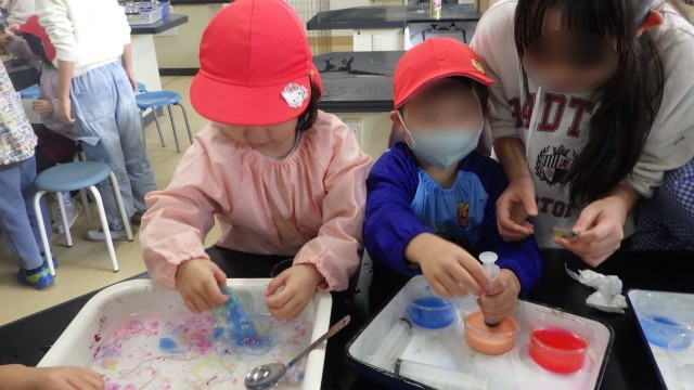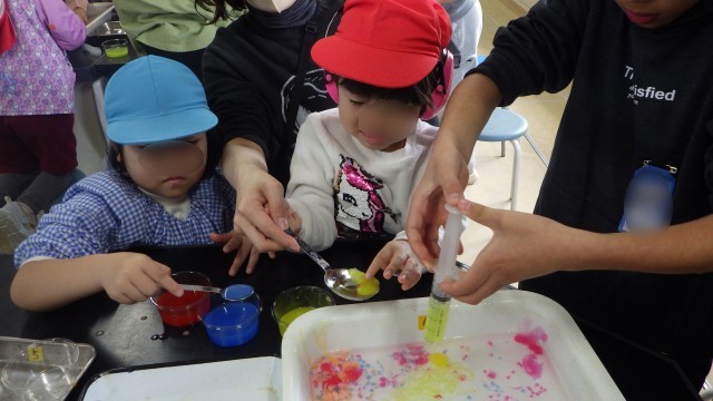 色水を注射器やスプーンで魔法の水の中に入れると、固まってつかめるようになる実験に、子どもたちは大喜び!