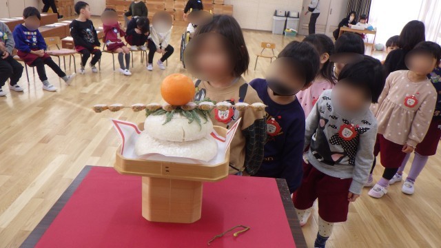 ばら組とゆり組の子ども達が遊戯室に集まり、みんなで鏡開きをしました。