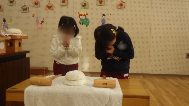 木槌で鏡餅を割る時には、これから頑張りたいことをそれぞれ心の中でお願いしました。新しい1年の始まりを、幼稚園のみんなで温かく過ごすことができました。