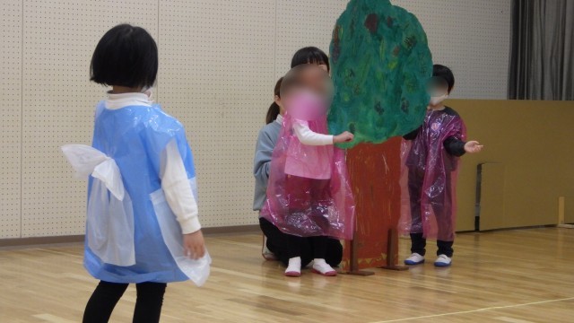 お話の世界でイメージを膨らませ、役になりきって遊んだり、セリフのやりとりをしたりして、表現することを存分に楽しんでいます。