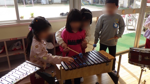 教えてあげる嬉しさ、教えてもらう嬉しさ、異年齢で一緒に演奏する楽しさを感じながら一緒に遊ぶ姿が見られます。