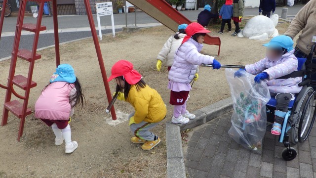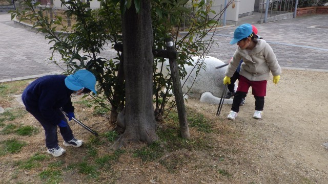 今日は、幼稚園の目の前にある小さな公園のゴミ拾いをしました。