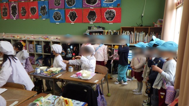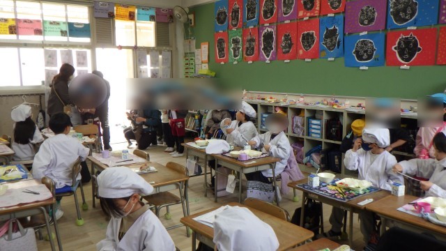 自分たちで給食室から食器やご飯を運んだり、配膳したりする様子に、小学生はすごいなあと感心している様子でした!