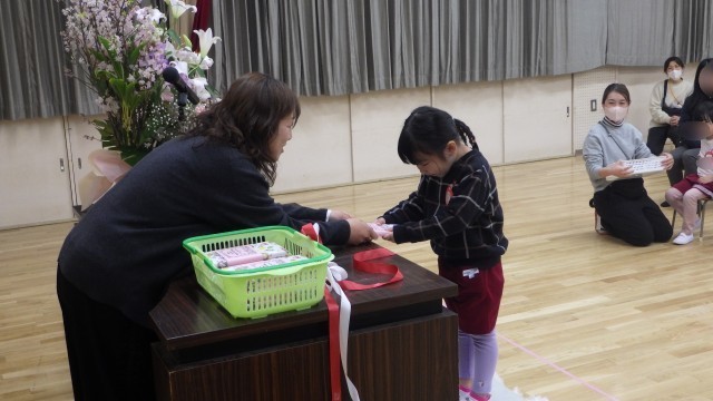 保育修了式でゆり組さんが証書をもらっていたのをまねっこして、ゆり組になる切符を園長先生からもらいました。
