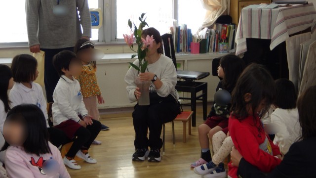 お部屋では、水色のカラー帽子をもらい、ゆり組の”ゆり”のお花を見せてもらいました。