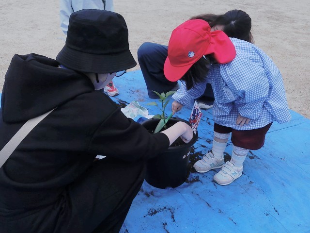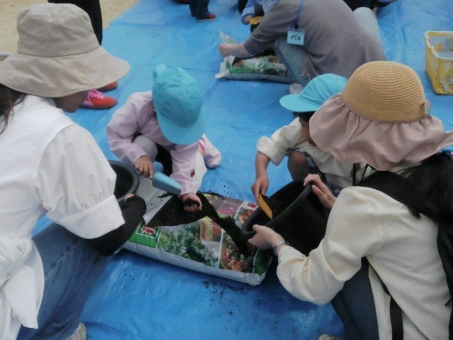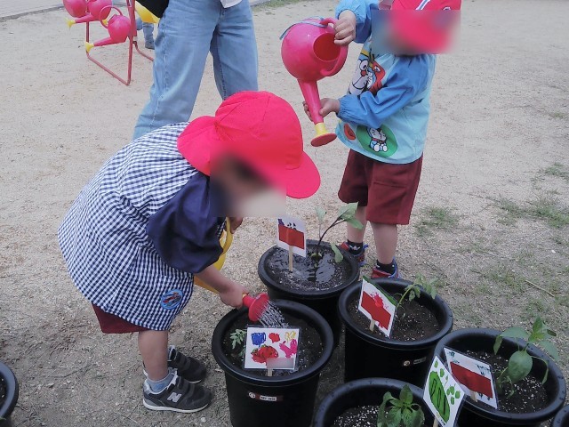 おおきくなあれと心を込めて植木鉢に土を入れたり、苗をポットから移し水をあげたりしていました。大きな野菜ができるといいですね!