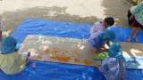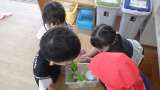 遊戯室で積み木を組み合わせてコースをつくっています。繰り返し階段や細い道などのコ...