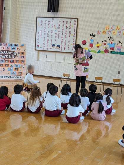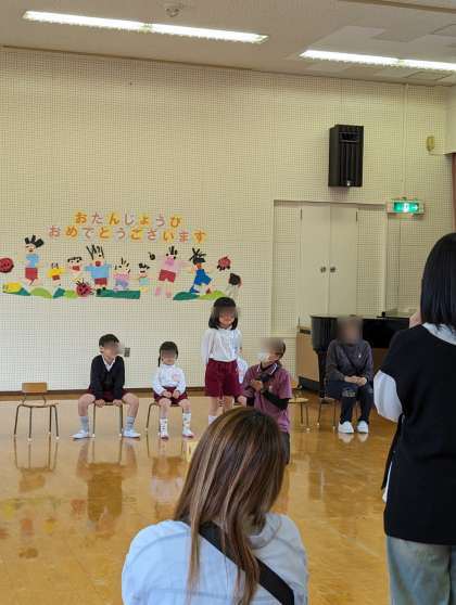 今日は4月、5月生まれのお友達の誕生会でした。今年度初めての誕生会、少し緊張している様子も見られましたが、みんなしっかりと参加できました。お家の方や、友達にお祝いをしてもらって嬉しかったですね。