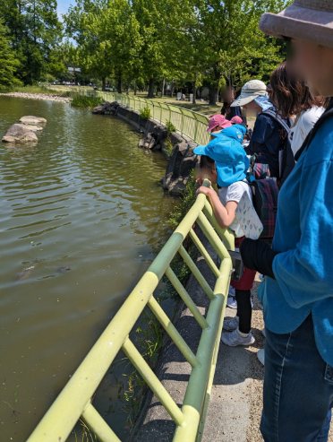 池にいるカメやコイも発見!嬉しそうに見ていました。