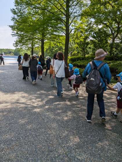 今日はお家の方と一緒に長居植物園への園外保育でした。とてもいい天気の中、芝生広場で体操をしたり、オリエンテーリングをしたりして遊びました。