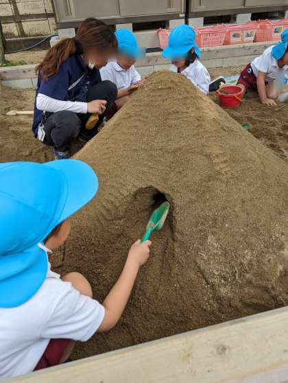 そら組さんがみんなで、山をつくっていました。みんなで力を合わせて大きな大きな山になりました。