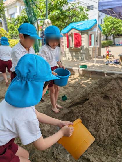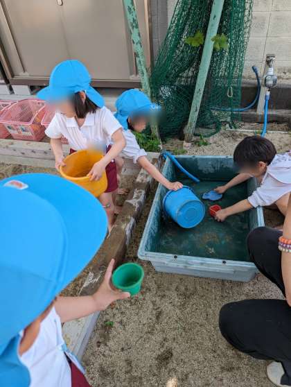 昨日に続いて砂場が盛り上がっていました。水を使って山を固めていったり、砂に水が吸い込まれる様子や、たまる様子に気づいて楽しんでいました。