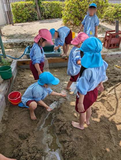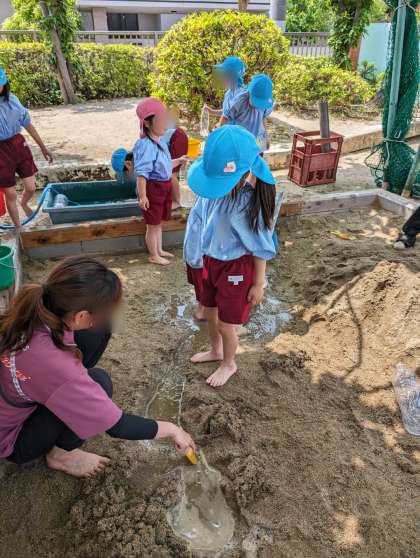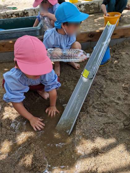 砂場での遊びが更に広がってきました。水を流したり、道(川)を掘っていったりして盛り上がっていました。裸足になって泥の感触や水の冷たさなども感じながら楽しんでいました。