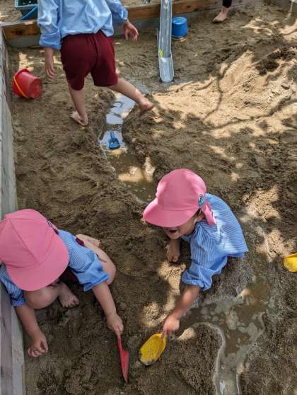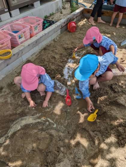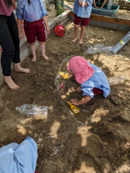 水をどんどん流していくと、スコップが流れていきました。「船になった!」とうれしそう!