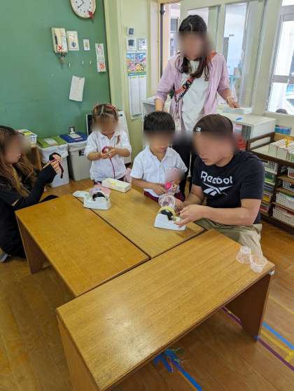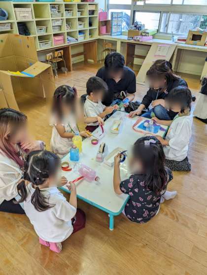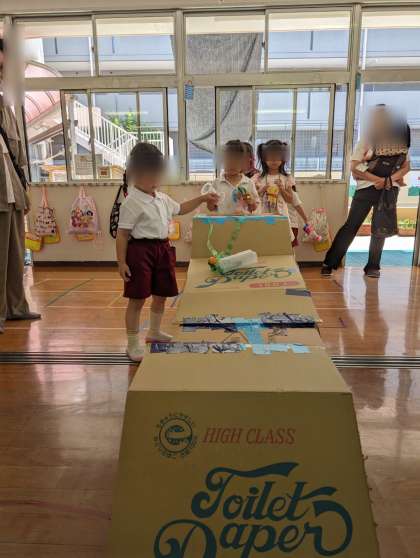 もも組さんは、ブロックや、テープの芯などを転がして遊ぶことを楽しんでいたので、今日はお家の方と一緒に転がるものを作って遊びました。キラキラテープで飾ったり、中にキャップを入れたり、、色々な「転がる」おもちゃができました。