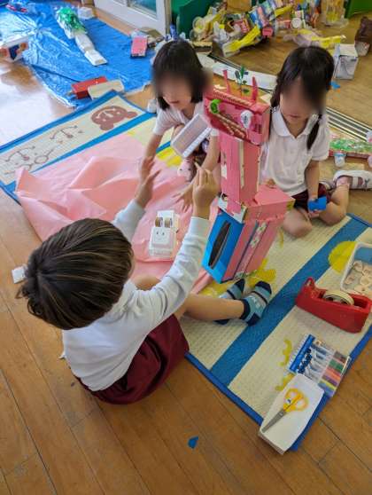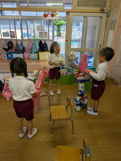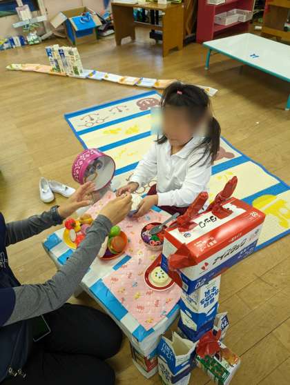 日曜参観で作った動物たちを使って楽しい遊びが広がっていました。鬼ごっこをしたり、ままごとのごちそうを並べて一緒に囲んだり、動物病院ごっこも始まりました。しっかり冷えピタや絆創膏、体温計も用意されていました。