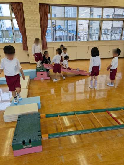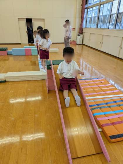 今日は1日雨が振りました。そら組さん、もも組さんが一緒にサーキットを作って遊びました。協力しあって積み木も運びました。でも滑り台が全然滑りません、、、。なぜかな?どうしよう?と聞かれて「もっと高くしなあかん!」と気づきました。無事に「滑る」滑り台になりました。