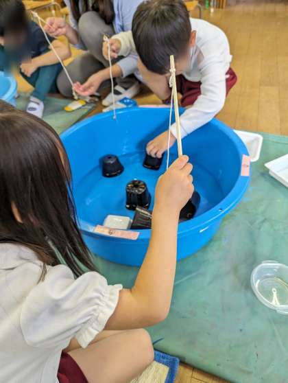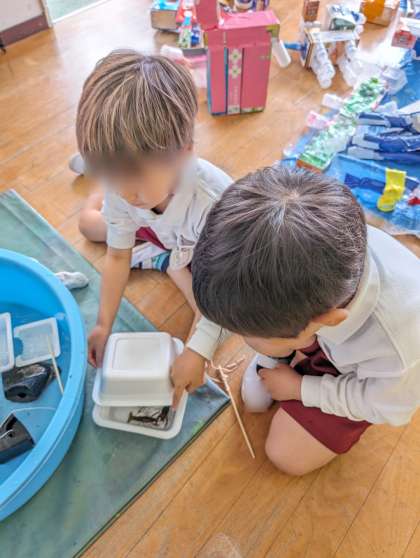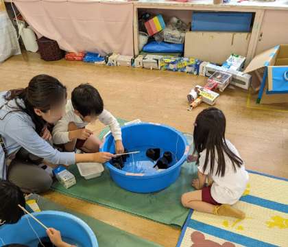 そら組が保育室でザリガニ釣りをしていました。糸を垂らして静かにそっと待てるかな?