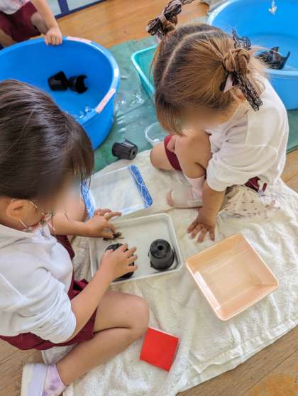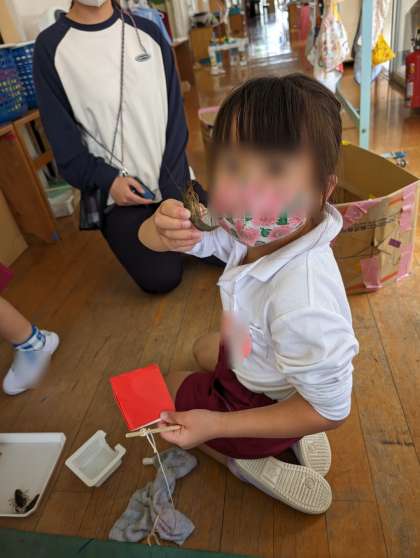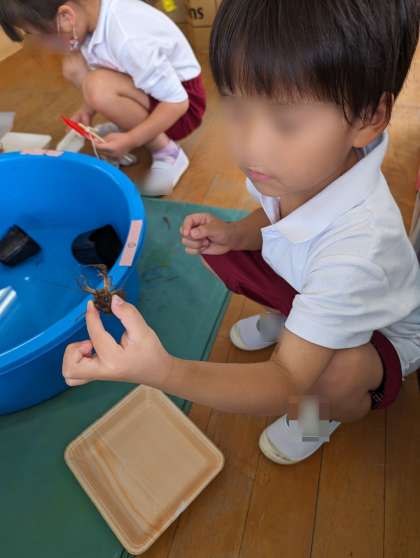 もも組さんも集まってきてザリガニを見ていました。「さわってみたい」ということで、ザリガニの持ち方(掴み方)を知らせていきました。「さわれた!!」と嬉しそうでした♪